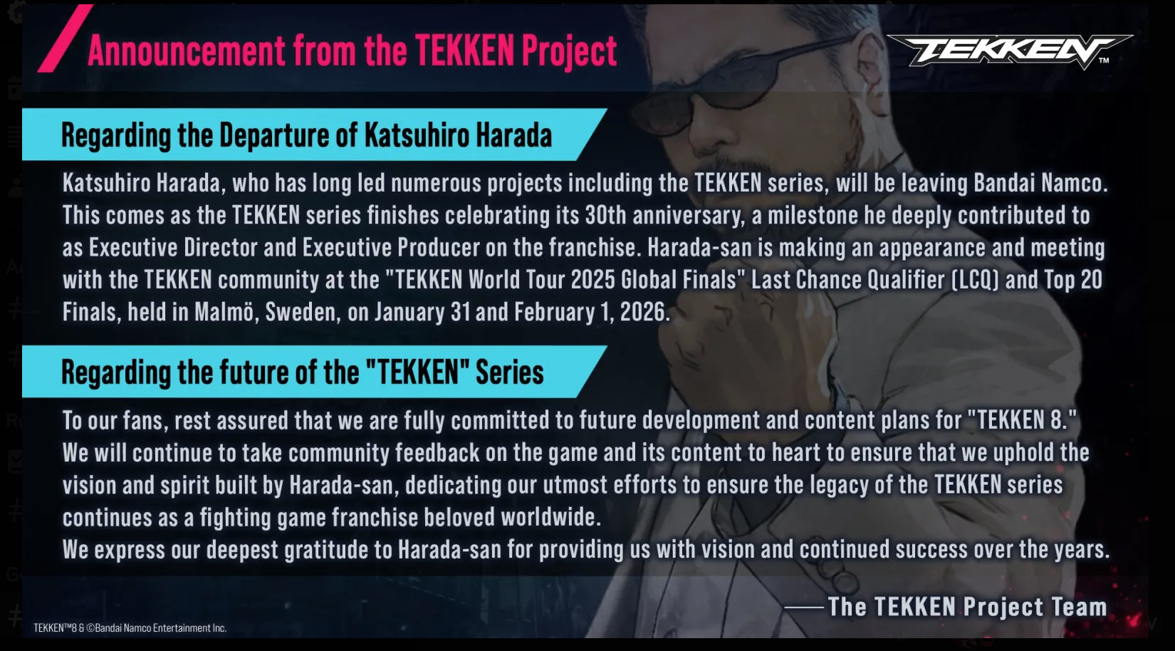 Harada forlater Bandai Namco i slutten av måneden, men har blitt spurt om å delta på TWT Finals i slutten av januar 2026, hvor han skriver at han kommer til å delta som gjest.