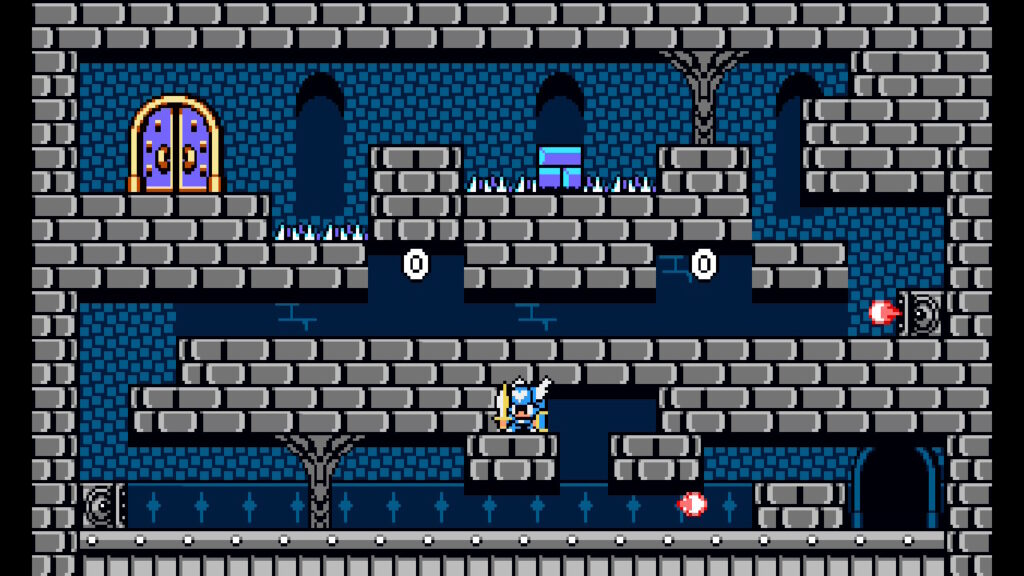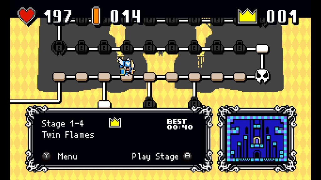 Brettdesignet er også veldig variert og godt utformet.Selv om spillet gjenbruker farger og tematikk over flere brett , føler jeg det er variert nok til at det aldri blir kjedelig. Og akkurat det at det aldri blir kjedelig er en viktig faktor siden hvert brett også skjuler tre gyldne kroner for deg å anskaffe. Kronene kan i tillegg til mynter brukes til å låse opp nye egenskaper i butikken du oppdager inne i slottet. Gameplay-loopen her er enkel, men utrolig vanskelig å legge fra seg når man har kommet i gang. Det begrenser seg til løping fra høyre til venstre, slå og hopp, men det er det fine med det. Spillet er lett å lære, og utfordrende å mestre. “Bare ett brett til” gikk på rundgang, og hodet var okkupert av lydsporet fra spillet i hver ledige stund.