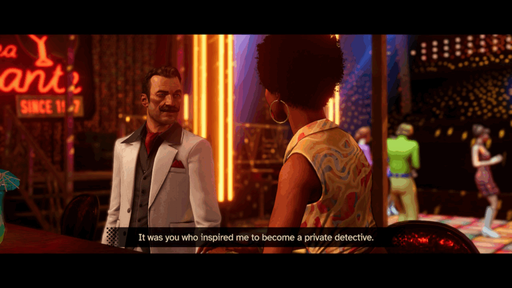 Det stilige 30-tallet er byttet ut med 70-tallets discostil, noe som gir en velkjent historie en litt freshere setting. Selv om jeg kunne ønske at de ikke hadde gitt Poirot en slags glow up. Det hadde vært en artig kontrast. At omgivelsene ser flotte ut, er et gjennomgående tema i spillet. Samtidig så misliker jeg sterkt stilen på karaktermodellene. Mulig at det er et meg-problem, men det som ikke er et meg-problem er hvor utrolig krøkkete animasjonene er.