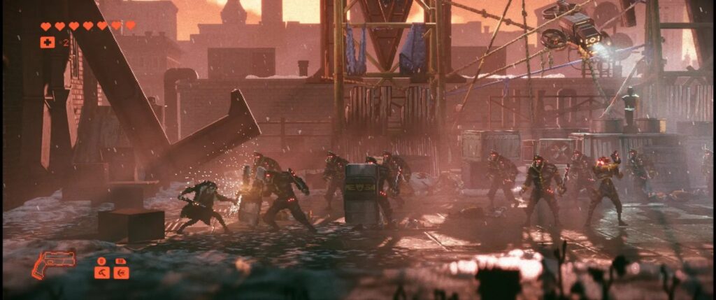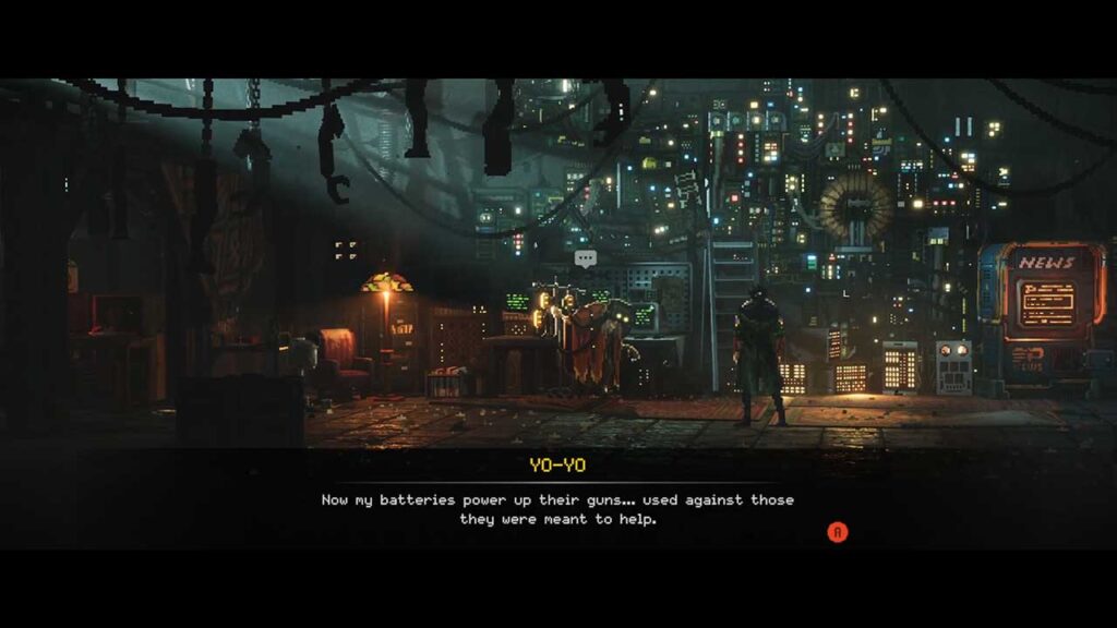 Den stilige verdensbyggingen understøttes av det grafiske uttrykket, som har vært ett av de fremste salgsargumentene til Replaced. Det hele kan minne litt om HD-2D-stilen til Square Enix-spill som Octopath Traveler, Triangle Strategy eller nyversjonene av Dragon Quest I-III, men i realiteten her får vi en blanding mellom mer tydelige piksler på rollefigurer og enkeltgjenstander på den ene siden og mindre pikselerte kulisser med et mer realistisk utseende på den andre siden. Resultatet er en 2,5D-opplevelse som befinner seg et sted mellom ren voxel-grafikk og retroestetisk pikselkunst. Kronen på verket er lyseffektene, der studioet åpenbart har brukt enormt med tid og krefter på å skape troverdig og realistisk lys. Spesielt imponerende er det å se refleksjonene eller de volumetriske effektene som oppstår når lys trenger gjennom røyk og slørete tåkeskyer. Det er lite som er like fryktinngytende som rødt dronelys som beveger seg sakte gjennom tåkeskyer, og med jevne mellomrom får du en fantastisk utsikt over Phoenix City hvor bare må stoppe for å nyte omgivelsene og detaljnivået.