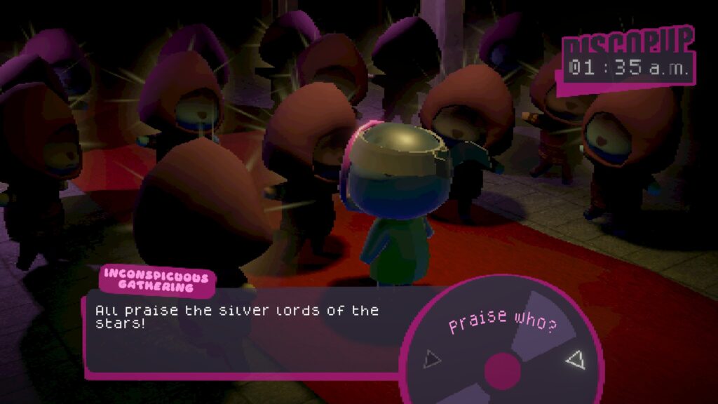 Discopup, utviklet av Parry Mechanics, er intet mindre enn et mesterverk som jeg syns har fått kriminelt lite oppmerksomhet. Spillet går i en klassisk time loop, hvor de fleste handlinger krever av tiden din, og klubben stenger klokken to. Utfordringen er å samle alle gjenstander innen da, men det vil du garantert ikke få til første loop. Det er heller ikke vanskelig å komme til dette punktet, men det er langt ifra klimakset til spillet.