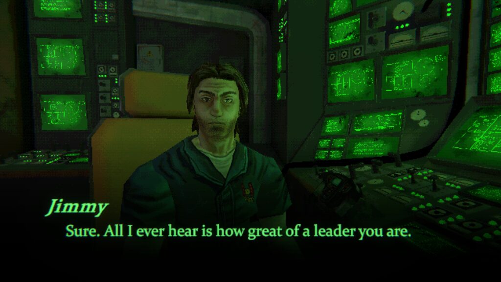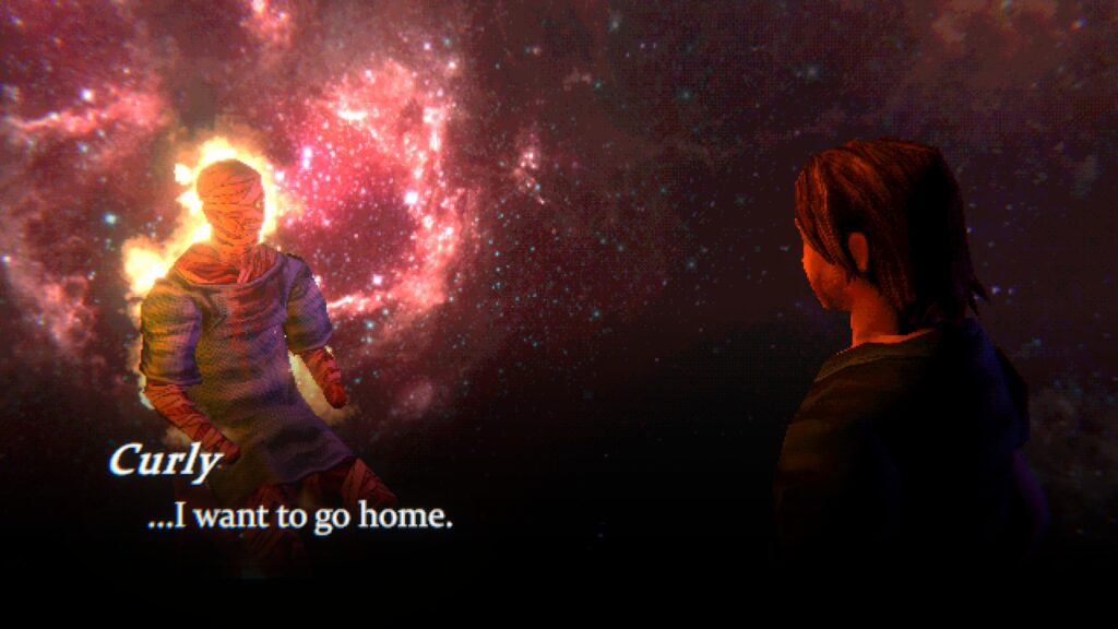 Spillets tidslinje hopper frem og tilbake, med utgangspunkt i før og etter krasjet. Jeg får dermed bli kjent med karakterene både gjennom øynene til Curly og Jimmy. Og de ulike perspektivene avslører en hel del om hvor upålitelige fortellerne kan være. Vanligvis er man som spiller disponert til å stole på hva man blir fortaltalt, fordi i denne historien er det kun den virkeligheten man kjenner til. Men i Mouthwashing tar utviklerne den antakelsen og pisser på den.